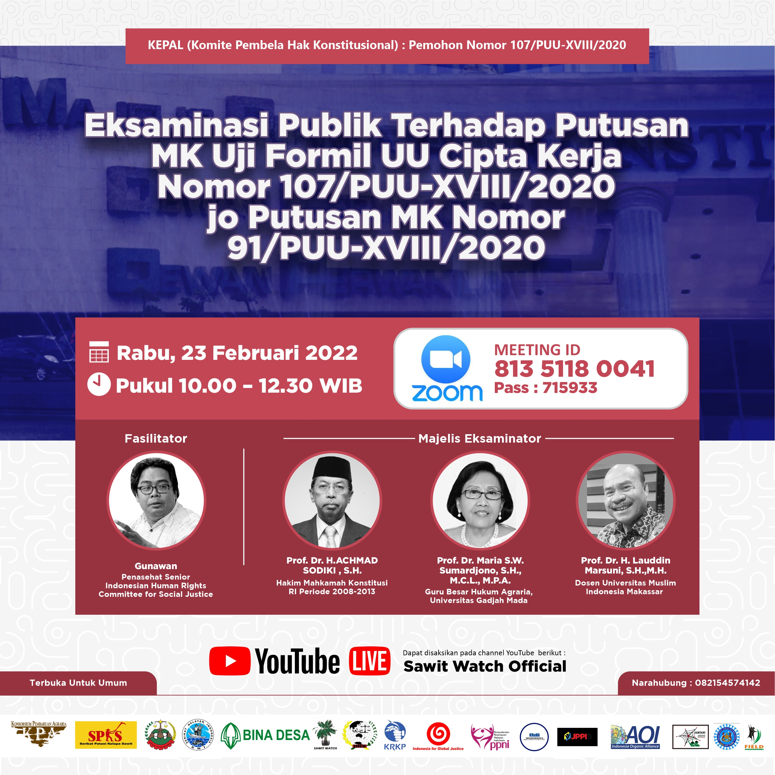 Merespon perkembangan terkini pasca putusan Mahkamah Konstitusi Uji Formil UU Cipta Kerja, Komite Pembela Hak Konstitusional (KEPAL) sebagai salah satu pemohon uji formil melaksanakan agenda Eksaminasi Publik terhadap Putusan MK Uji Formil UU Cipta Kerja Nomor 107/puu-xviii/2020 jo putusan mk nomor 91/puu-xviii/2020 pada hari Rabu, 23 Februari 2022 bertempat di Hotel Teras Kita, Jakarta.
